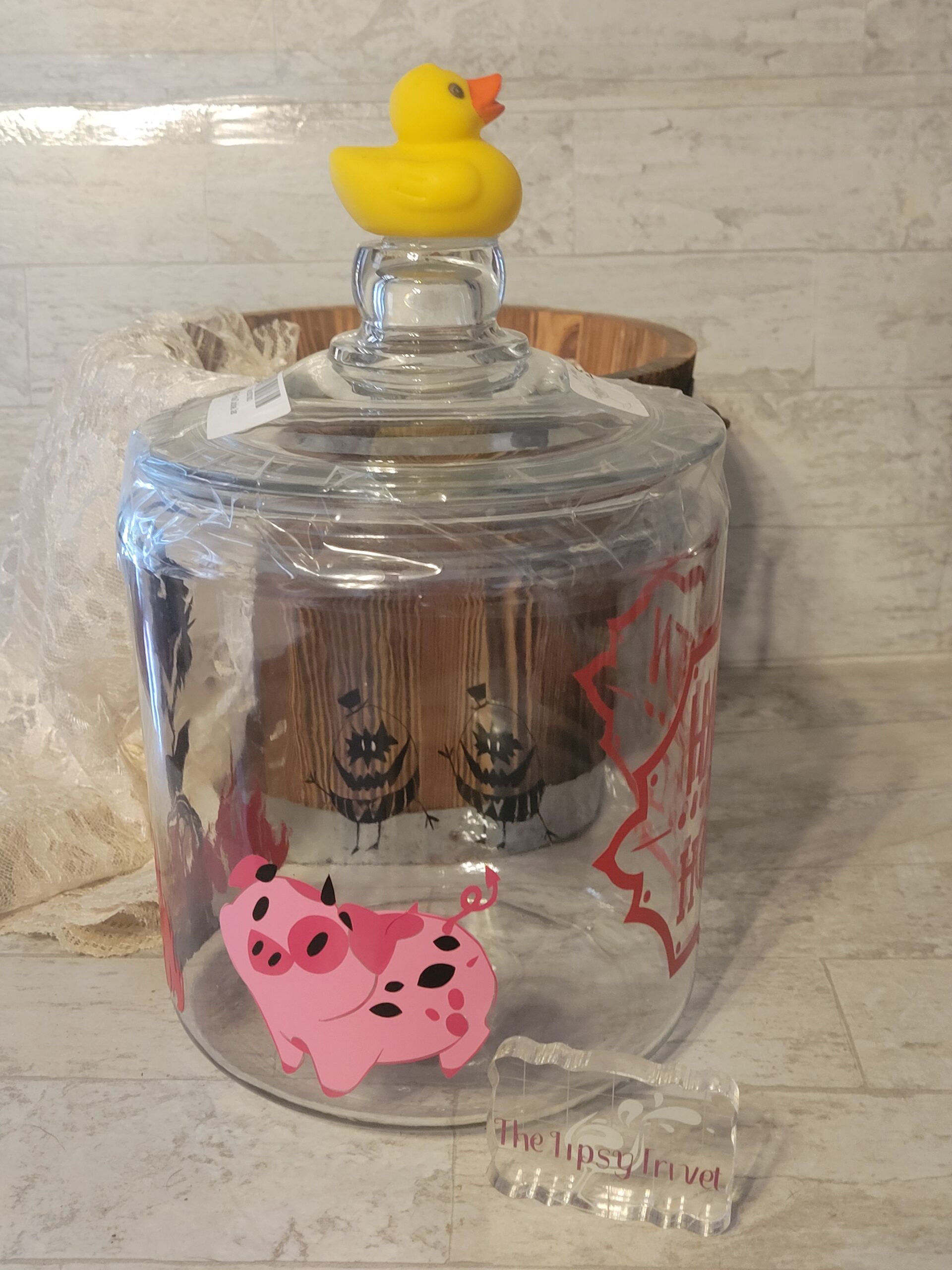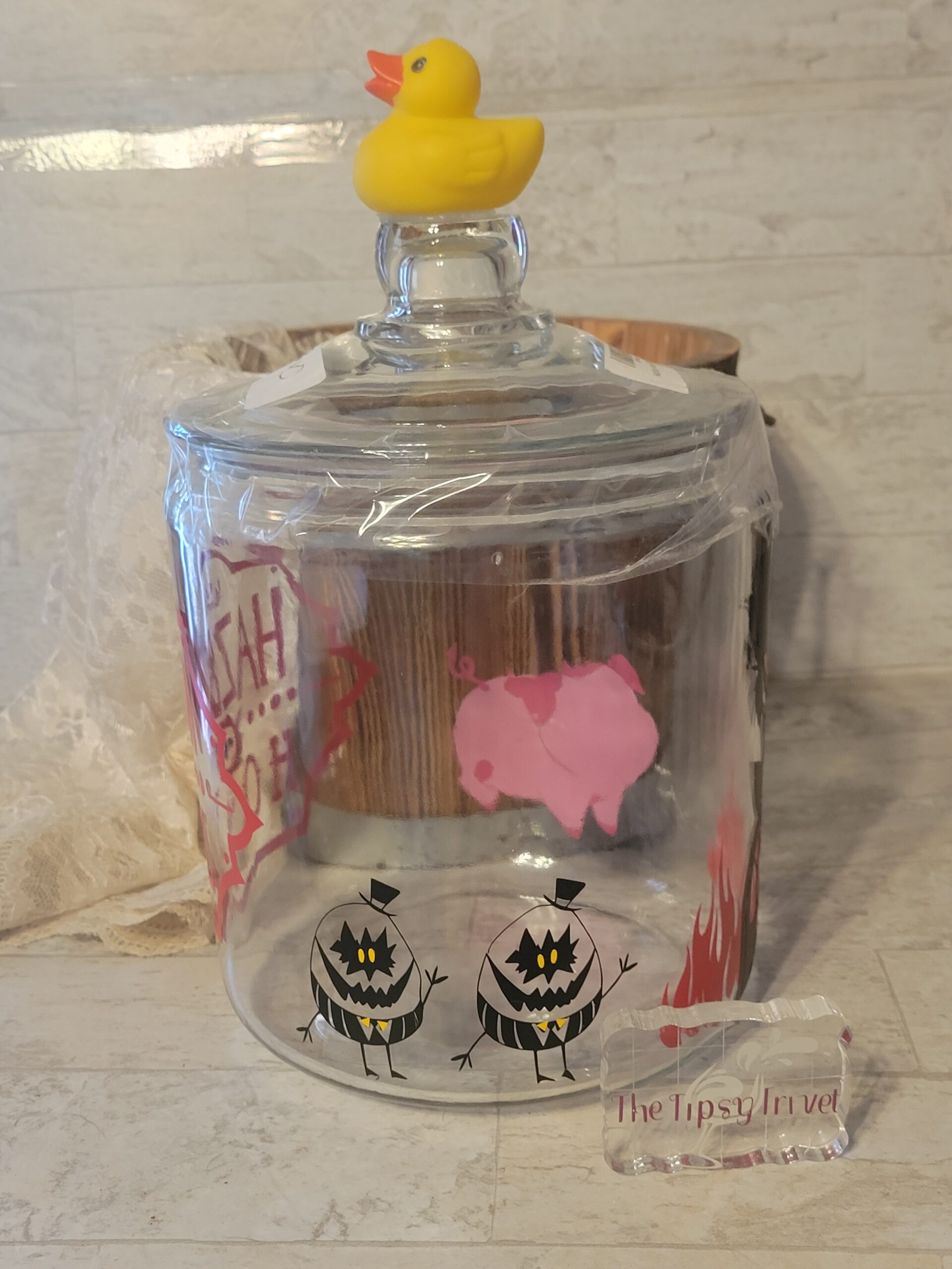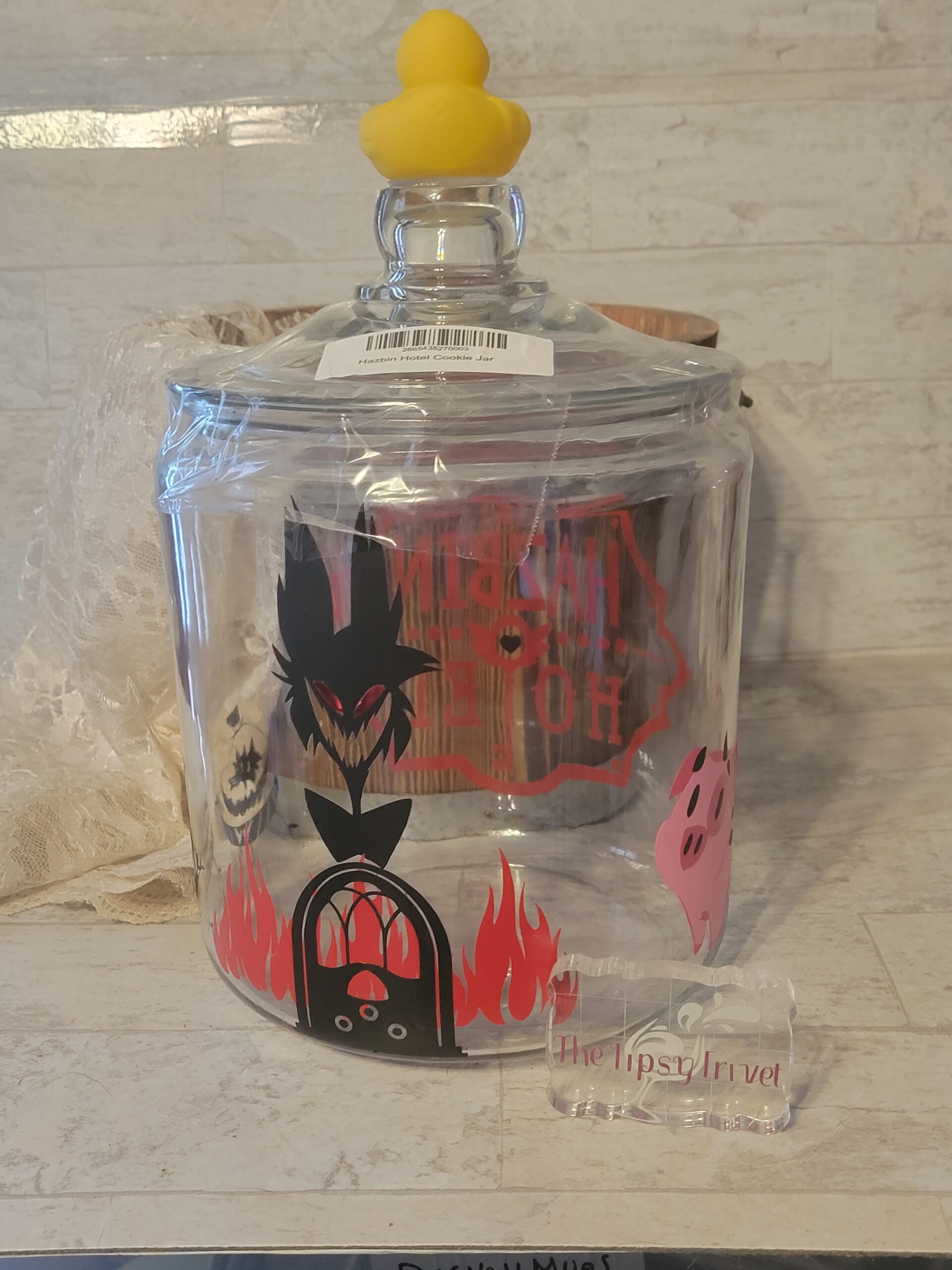 - Product is custom made showcasing the Hazbin Hotel logo, Alastor, Egg Bois, and Fat Nuggets. On top is a rubber ducky!