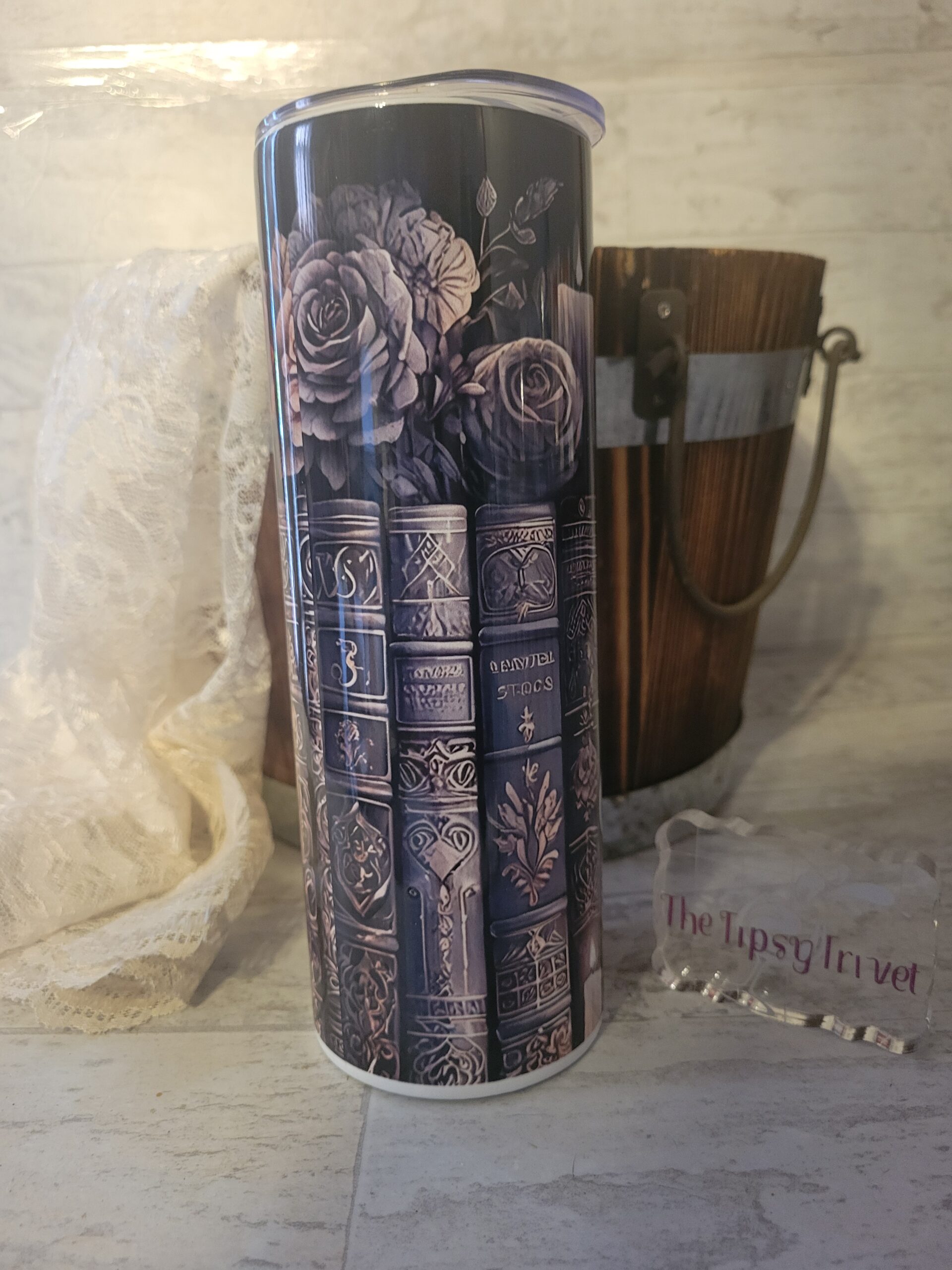 Cozy up with your favorite book and sip in style with our “Just One More Chapter” tumbler from The Tipsy Trivet. Perfect for book lovers and late-night readers, this beautifully designed 20 oz tumbler features vintage-style stacked books and glowing candle artwork that captures the mood of a quiet reading nook.